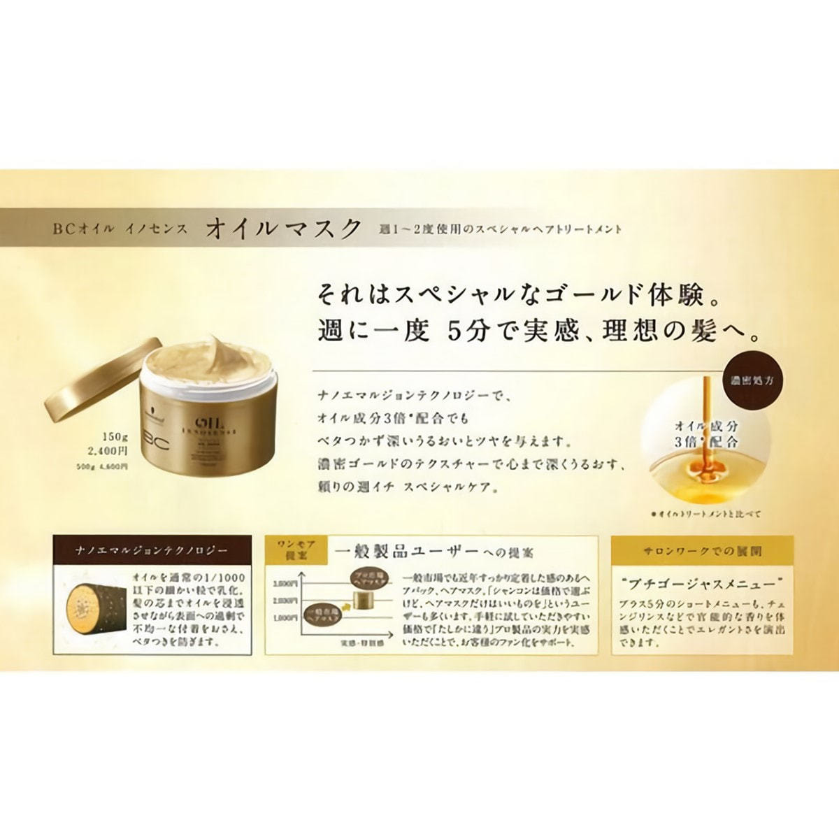 濃密ゴールドのテクスチャーで心まで深くうるおす、頼りの週1スペシャルケア。 集中ケア用のトリートメントとして、ホームケアにご使用ください。
