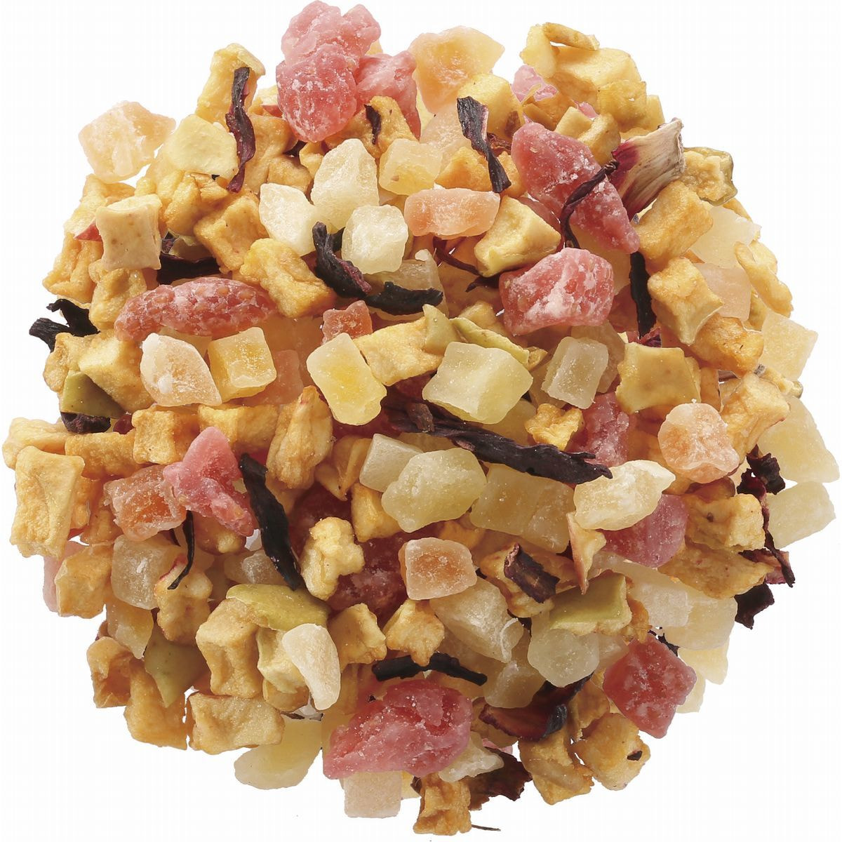 加糖ドライピーチ(タイ製造)、加糖ドライストロベリー、有機ドライアップル、加糖ドライパパイヤ、加糖ドライマンゴー、加糖ドライパイナップル、有機ハイビスカス/香料、クエン酸、保存料(亜硫酸塩)、着色料(赤40)